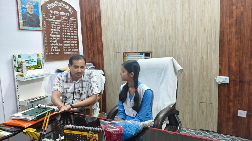 मिशन शक्ति योजना के अन्तर्गत राजकीय इंटर कॉलेज मटौंध की दसवीं की छात्रा कु० शिफा को एक दिन के लिये जिला कृषि अधिकारी बांदा का प्रभार संजय कुमार, जिला कृषि अधिकारी द्वारा दिया गया। जिसमें उनके द्वारा कार्यालय के कर्मचारियों से परिचय प्राप्त करते हुये बुद्धराज सिंह,अपर जिला कृषि अधिकारी राजेश कुमार,वरिष्ठ सहायक,शरदलता, वरिष्ठ सहायक, प्रदीप कुमार,कनिष्ठ सहायक से उनके द्वारा सम्पादित किये जा रहे कार्यों यथाः राजेश कुमार से स्थापना पटल, शरदलता से बिल आदि एवं प्रदीप कुमार से डिस्पैच एवं रिसीट पटल की समीक्षा की गयी। साथ ही उर्वरक की उपलब्धता, वितरण एवं अवशेष की भी समीक्षा की गयी। साथ ही उनके द्वारा उर्वरक वितरण में आ रही समस्याओं के समाधान के बारे में भी बताया गया।
