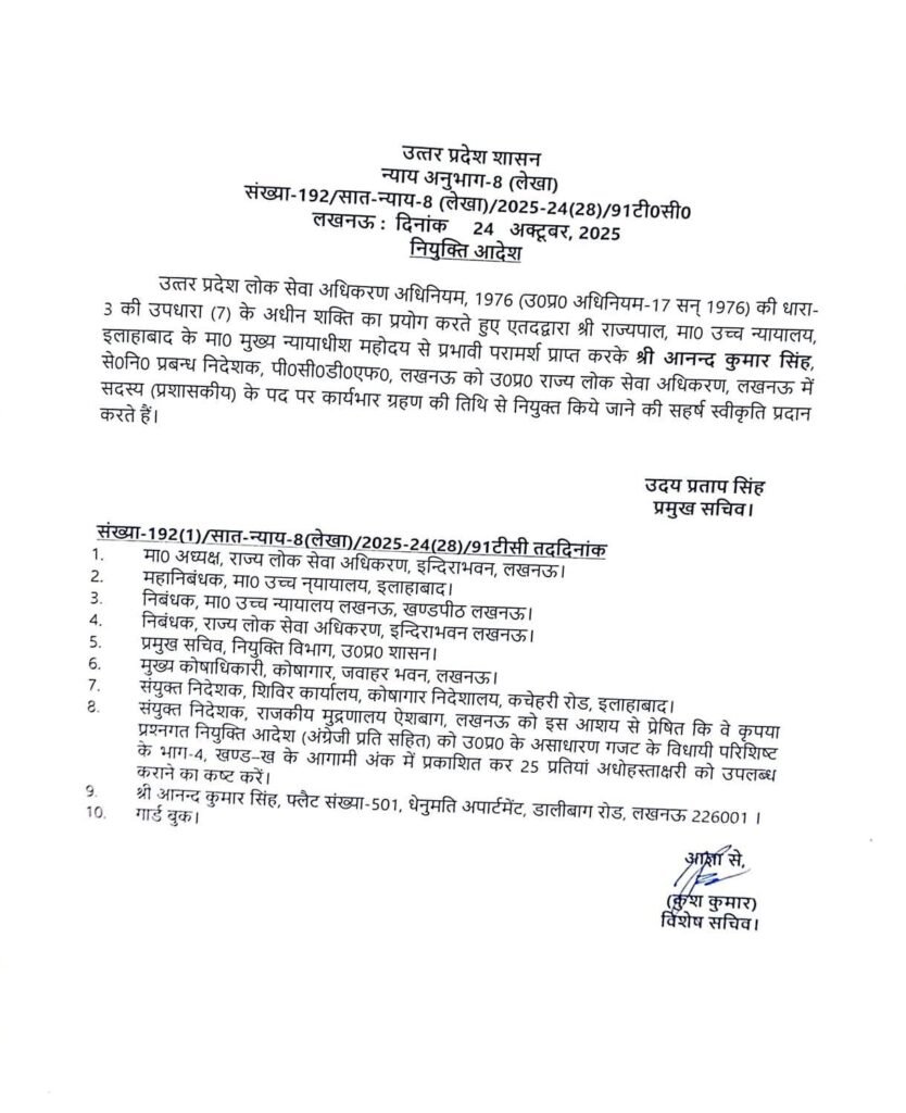 उत्तर प्रदेश के मूल रूप से औरैया जनपद के रहने वाले 2009 बैच के आईएएस अफसर आनंद कुमार सिंह की गिनती लगनशील तथा मेहनती के अलावा अच्छे ऑफिसरो में होती थी। विगत वर्ष आईएएस आनंद कुमार सिंह पीसीडीएफ प्रबंध निदेशक के पद से सेवानिवृत हुए थे। इसके पहले वह जिलाधिकारी संभल,बांदा के अलावा महत्वपूर्ण पदों पर अपनी सेवाएं दे चुके हैं। राज्यपाल तथा उच्च न्यायालय के मुख्य न्यायाधीश के परामर्श के बाद सरकार ने उन्हें अहम जिम्मेदारी सौंपी है। आईएएस आनंद कुमार सिंह को लोक सेवा अभिकरण का सदस्य बनाया गया है। सरकार ने शनिवार को आदेश भी जारी कर दिया है।